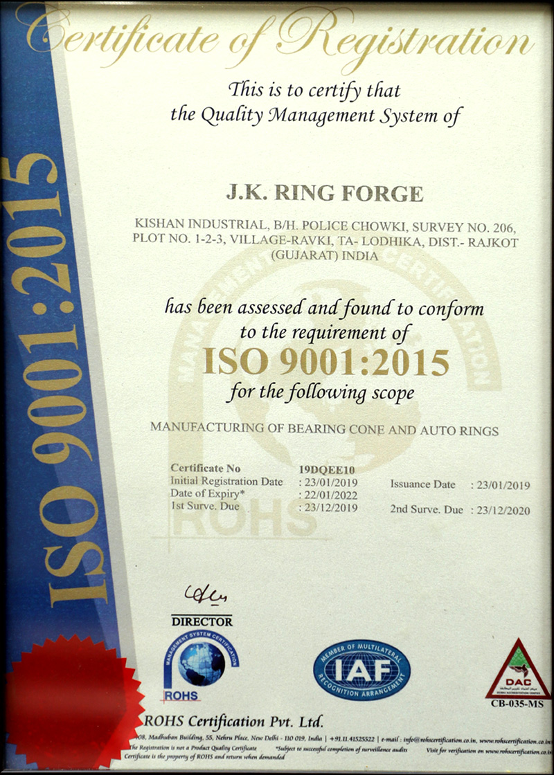 JK Ring Forge is managed by well qualified & experience professional Person, having last 11 years experience in forging unit. We are an ISO 9001-2015 quality accredited company by TUV Rheinland. JK STEEL FORGING We follow processes its own inspection plan for all the components and it’s process cycle at different stages of production. JK Ring Forge We are starts with understanding the Customers Requirement and continues till the customer is completely satisfied with the delivery of products and services. Quality Control procedures are well defined and thoroughly implemented. Forged SS Ring, Forged Bearing Races & Automotive Components built for result oriented work culture, to fulfill customer's needs in terms of Cost, Quality and Delivery. By enhancing effectiveness of people and plant equipment safely we are aiming towards zero losses. We also believe in continual improvement for effectiveness of Quality Management System through Team Work, Training and Focus on Actions and Results. We are continually improving our quality to serve our clients better.